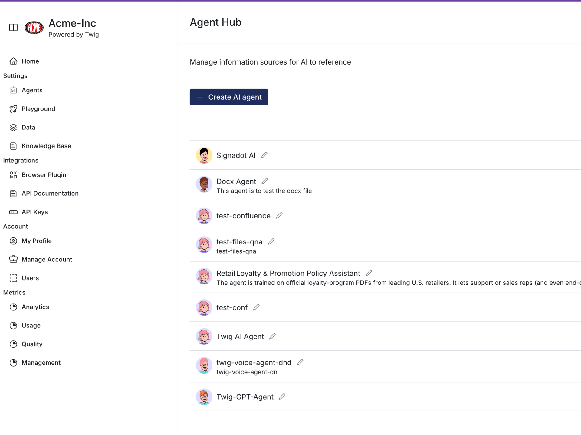 Each agent built on Twig is powered by enterprise-grade RAG and evaluation pipelines, ensuring reliable, context-aware responses across real business data. Teams can customize behaviors, track performance, and iterate without writing extra code. Whether it’s a support bot, knowledge assistant, or internal co-pilot, Twig turns AI agent creation into a fast, repeatable process—making enterprise-ready automation accessible to every developer.